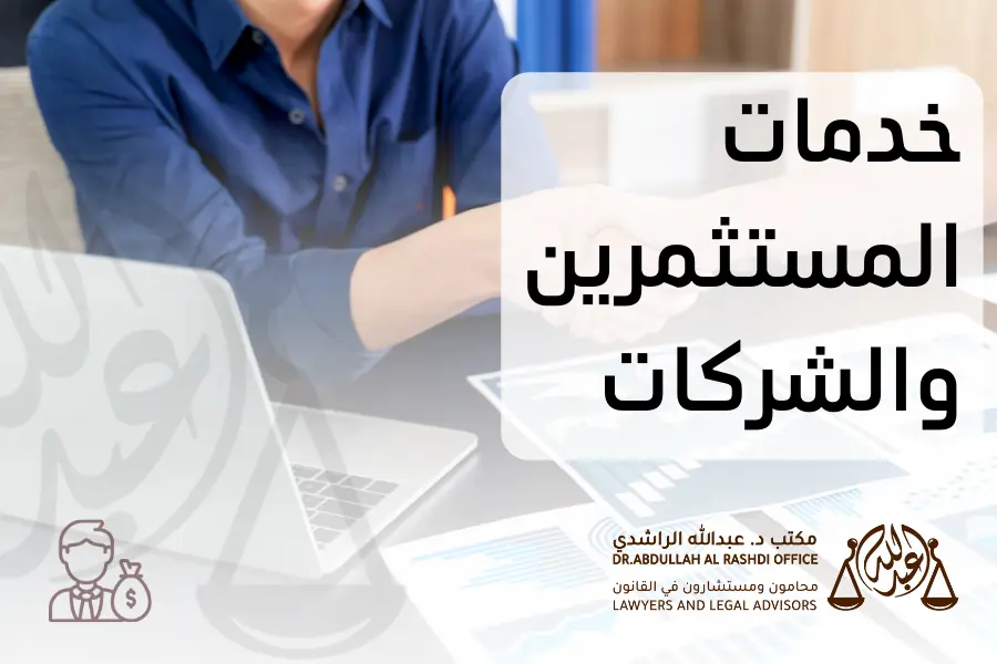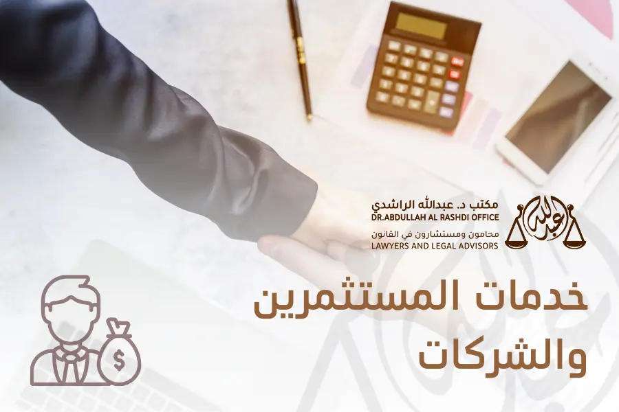 يقدم المكتب الخدمات القانونية للمستثمرين والشركات في جميع المجالات ومساعدتهم في حفظ حقوقهم وتسجيل وتأسيس الشركات وفقاً لقانون الشركات التجارية والقوانين المنظمة لعمل المستثمر، مع تقديم المشورة القانونية